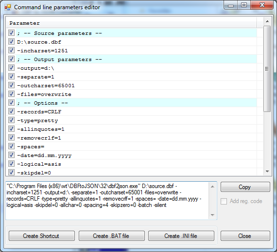 Command line parameters allows you to launch DBF to JSON Converter from your own applications, command files, and so on.