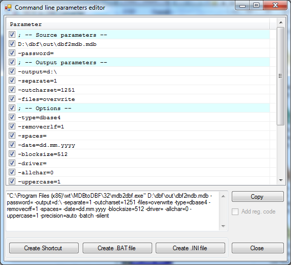 Command line parameters allows you to launch MDB to DBF Converter from your own applications, command files, and so on.